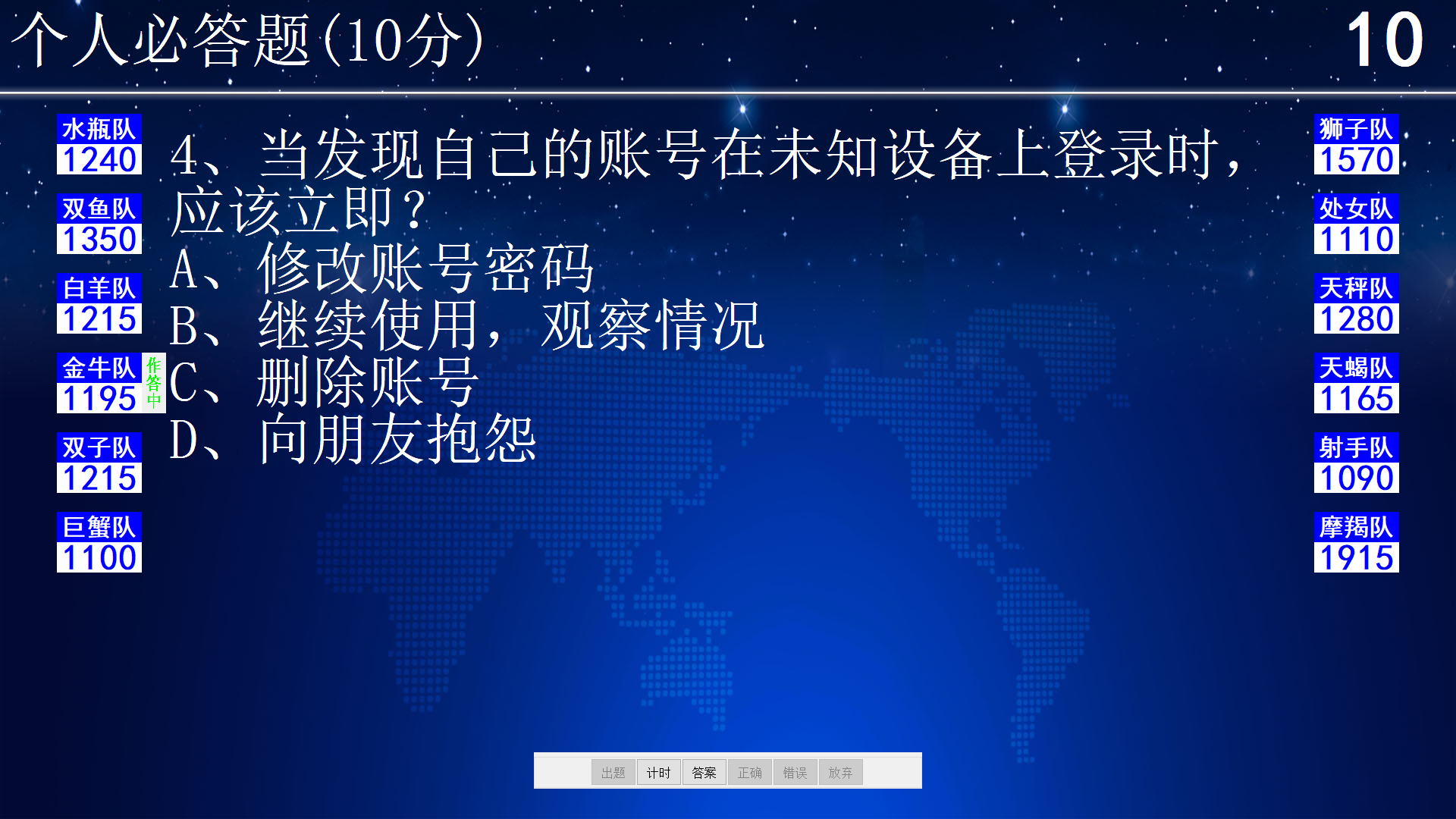 该系统支持文字、图片、音频、视频等多种媒体格式的竞赛题目。竞赛共分为个人必答题、团队必答题、风险题、抢答题四个环节,又根据题目难度分为初级、中级、高级三个档次。必答题答对加分,答错不计分;风险题答对加分,答错减分,放弃不计分:抢答题答对加分,答错、放弃、抢答失误减分。
